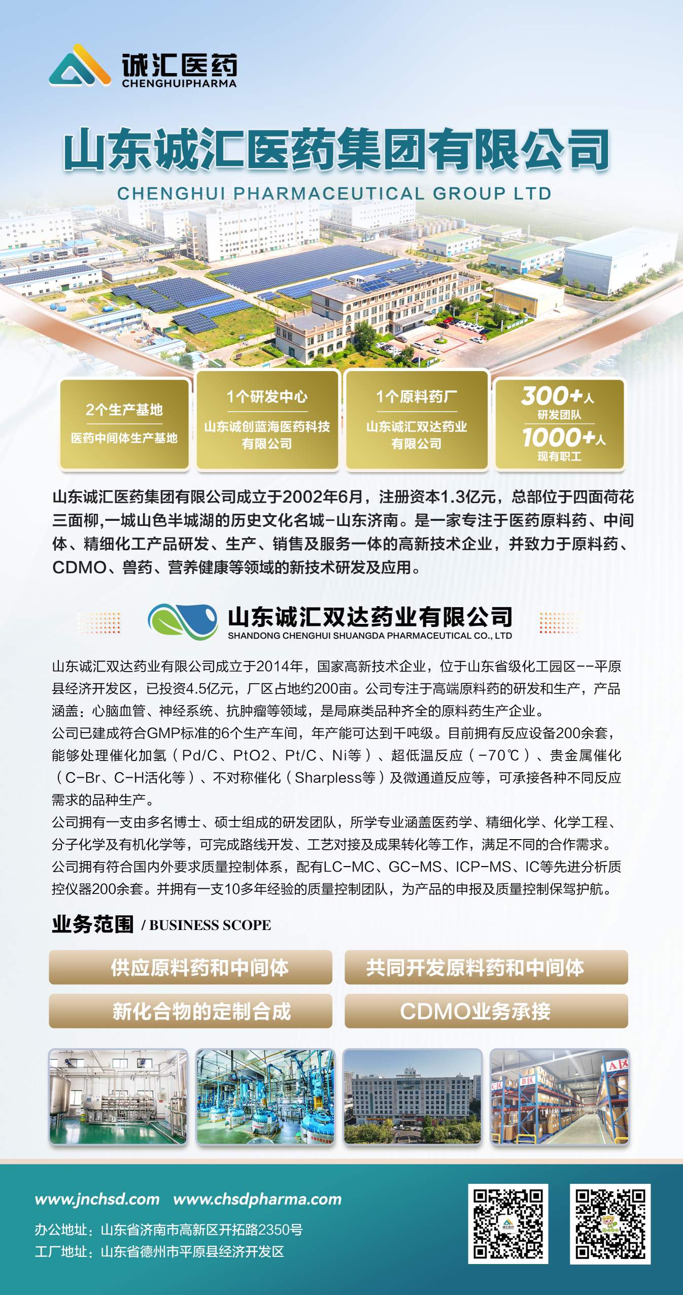 山東誠(chéng)匯醫(yī)藥集團(tuán)成立于2002年,總部坐落于山東濟(jì)南,專(zhuān)注于: