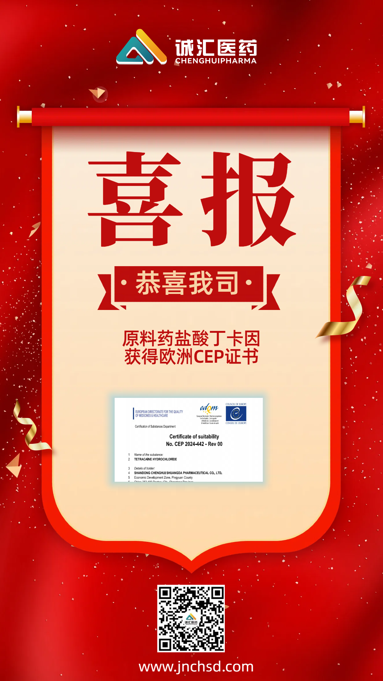 2025年8月20日,我公司原料藥鹽酸丁卡因獲得歐洲藥品質(zhì)量管理局(EDQM)簽發(fā)的歐洲藥典適用性證書(CEP證書)。